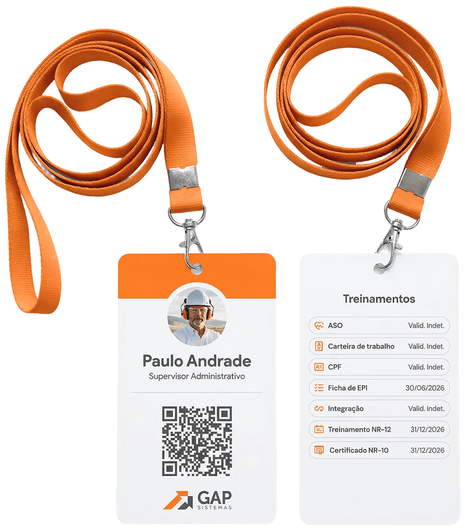 Gere automaticamente crachás de identificação com QR Codes para consulta rápida e segura do status atualizado de qualquer profissional em campo.